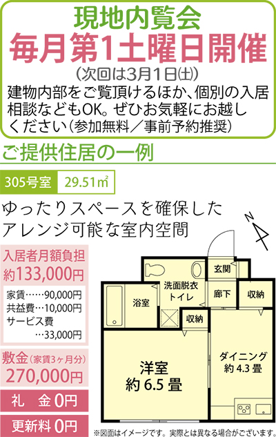 こうした、地域も一体となって醸成する「老人ホームと同様の安心感」と「プライベート尊重」を兼ね備える同所の暮らしぶりを知る事ができる「無料内覧会」は適時実施中。「不明な点などは、何でも相談を」と参加を呼び掛けている。