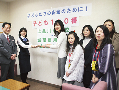 城南信用金庫上星川支店(森義範支店長)に、近隣の上星川小学校の関係者が訪れ「子ども110番あんしんの家」と記された黄色いプレートを手渡した。
