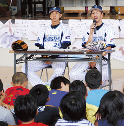 横浜DeNAベイスターズの梶谷隆幸選手と白崎浩之選手が、瀬戸ヶ谷小学校を訪れ、夢について語り合う授業を行った。