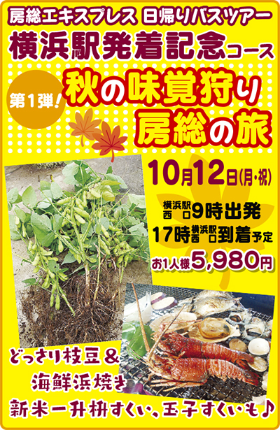 枝豆の収穫体験や新米の一升枡すくいなど、千葉の恵みが詰まった日帰りバス旅行。10月12日(月・祝)、横浜駅西口から出発する。お昼は海を眺めながら海鮮浜焼きに舌鼓。房総エキスプレスの横浜駅西口発着を記念しての第1弾企画で、1人5980円の特別価格に。この機会に秋の美味しいものを探訪してみては。他の記念コースは次の通り。