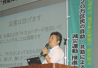 行政による災害対策だけでなく、住民主体の自助や共助を推進するため、区災害対策連絡協議会らが2年前から進めている「20万区民の自助・共助による減災運動」の推進大会が9月26日、保土ケ谷公会堂で開かれ区民らが活動事例報告や専門家の講演などを通じ有事に備えた。