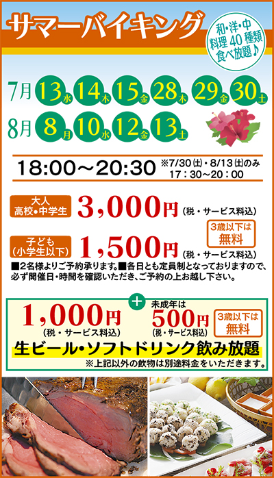 天王町駅徒歩1分の結婚式場モンテファーレでは、夏恒例のサマーバイキングを開催する。開催日は、7月13日(水)、14日(木)、15日(金)、28日(木)、29日(金)、30日(土)、8月8日(月)、10日(水)、12日(金)、13日(土)の10日間限定。時間は各日午後6時から8時30分。(土曜開催は午後5時30分から8時)。
