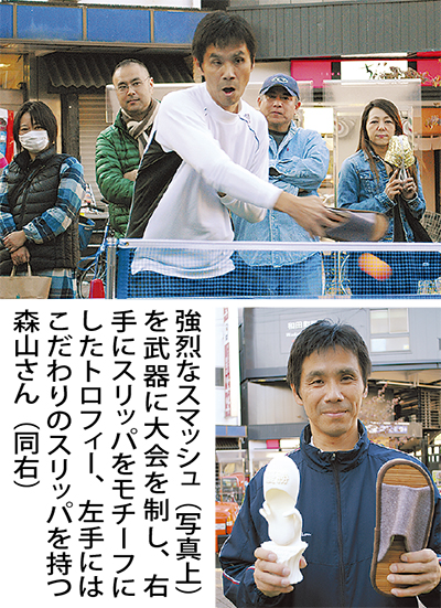 「全ほどスリッパ卓球選手権大会」の頂上決戦大会が11月12日、相鉄線和田町駅前の広場で開かれ、川島町に暮らす会社員・森山泰年さん(50)が初代王座についた。
