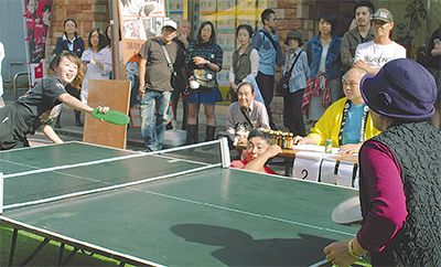 商店街の若手有志らが「何か面白い試みで商店街を盛り上げよう」と企画した「第1回和田町スリッパ卓球選手権大会」が10月24日に催された。この日は35人がエントリーし熱戦を繰り広げた=写真。