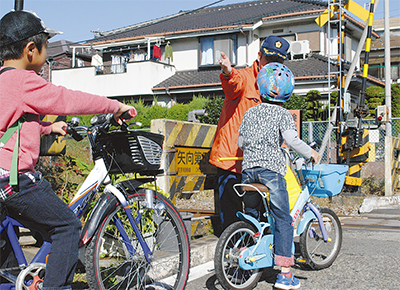 当日は、矢向小から踏切や交差点を通る約1Kmのコースを設置。参加者は普段使用している自転車を使用し、ポイントごとに走行方法のアドバイスを受けた。