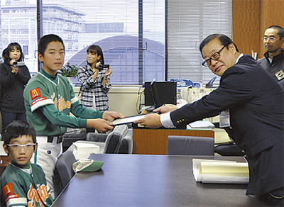 選手らは区長に「プロに行きたいか」と尋ねられると、ほとんど全員が挙手。球児たちの大きな目標に、区長は「夢に向かって頑張ってほしい」と激励した。