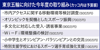 またこうした動きに関連して、市は今年度「東京五輪に関連する事業費」として2900万円を計上している。内訳は「横浜市への交通アクセスや市内の周遊などを改善するための調査費用」(500万円)や、情報発信地としての基盤となる「インターネットの環境整備費」(500万円)など=上表。ハード面のみならず、大会開催時にアスリートとして旬を迎える市内の小・中学生などを対象とした「過去の五輪メダリストとの交流事業」や、身体障害者を対象とした「パラリンピックを目指す子ども達をサポートする費用」といったソフト面の拡充に関する費用も含まれている。