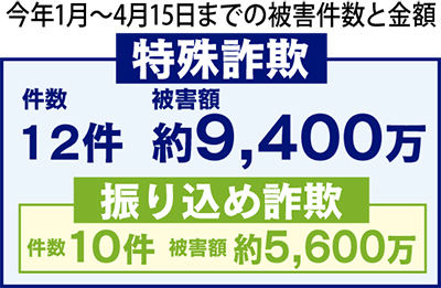 同署によると、4月15日までに発生した特殊詐欺は12件で、被害額は約9400万円。
