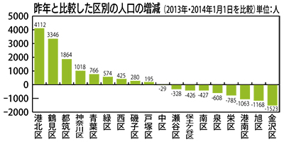 鶴見区は、世帯数の増加率で18区中トップの1・8%増。転入による社会増加数も2870人と最もプラスとなった。
