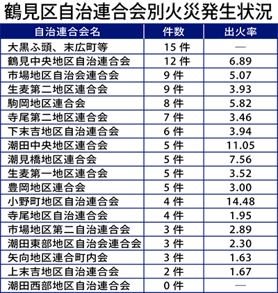 区内の自治連合会別でみると、大黒ふ頭・末広町等の15件に次いで、鶴見中央地区の12件、市場地区、生麦第二地区の9件、駒岡地区の8件と続いている。人口一万人あたりの出火件数を指す出火率では、小野町地区が14・48(4件)と最も高く、潮田中央地区も11・05(5件)と高い値となっている。