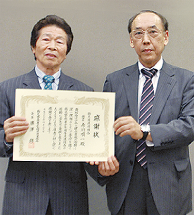 年末に鶴見警察署少年補導員連絡会(藤澤修会長)へ寄付金を贈呈した鶴見遊技場組合(赤川順一組合長)が4月20日、同会から感謝状を授与された。
