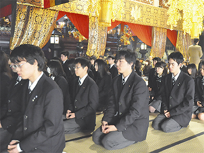 鶴見大学付属中学校・高等学校(亀山仁校長)の生徒が1月9日、大本山總持寺で座禅を体験する「耐寒参禅会」に参加した。