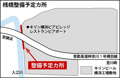 キリンビール横浜工場=生麦1の17の1=が今秋をめどに、自社工場横の入江川護岸に桟橋の設置を進めていることがわかった。完成後は、現在みなとみらいや山下公園などの発着施設を活用している観光船事業者と連携し、新たな水上観光ルートが開設される予定だ。同工場広報担当者は「横浜工場でしかできない新たな魅力になる」と期待を寄せる。