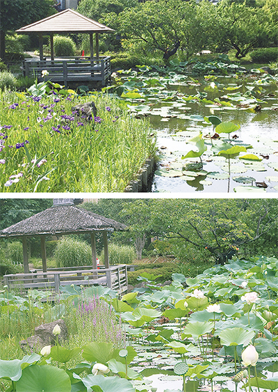ハスは6月中旬ごろから葉が伸び始め、後に花が咲き始める。例年は池のほとんどが葉で埋まるのに対して、今年は5〜6割程度。水面で茶色く枯れているものも多いという。