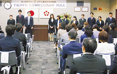 開講式の4日、一期生を前にあいさつした金井さんは、「制度が軌道に乗るのは10年後、20年後かもしれない。誰もが安心して受けることができるよう、土台作りを」とエールを送った。同院は来期以降、対象を県内の看護師に広げ、研修を行っていくとしている。