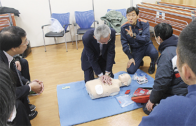 顧客に中高年が多いことから、緊急の事態に対応できるようスタッフが救命のスキルを学ぶ読売新聞販売店の取り組み。