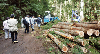 当日は会員など32人で同村を訪問。参加者は大田村長から森林や水源の保全・活用について説明を受け、実際に森林を散策しながら伐採作業などを見学した。村長とNPO法人道志・森づくりネットワーク大輪代表との懇談では、森林や水源保全の今後の取り組みなどについて意見交換。間伐材を使って沸かした温泉に入るなど、全身で自然の豊かさを体感した。