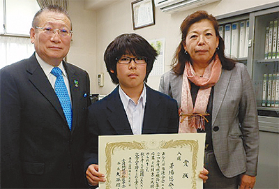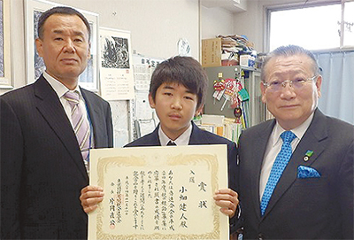神奈川間税会には約800の応募があり、菅田中学校(応募当時池上小学校)の茅場悠介君=写真上・中央=の作品「この国の未来に活かす消費税」(全国間税会総連合会表彰)と、松本中学校(応募当時三ツ沢小学校)の小畑健人君=写真下・中央=の作品「国民を支えるための消費税」(東京国税局間税会連合会表彰)の2人が応募した作品が入選した。