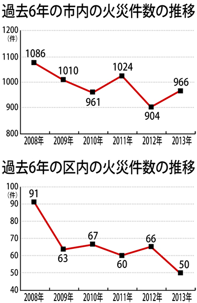 横浜市消防局はこのほど、2013年の「火災・救急概況(速報)」を発表した。市内で起きた火災件数は前年比62件増となった一方、神奈川区の火災件数は前年比16件減の50件にとどまった。