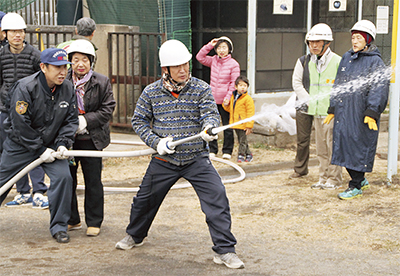 当日は神奈川消防署の指導のもと、住民15人がスタンドパイプの使い方を学んだ。「見ているだけでは意味がない」という野村会長の呼びかけで、参加者全員が消火栓を開けて放水するまでを実践。互いに声を掛け合い、校庭のジャングルジムめがけて放水した。野村会長は「女性でも簡単に扱えるので安心。いざというときに焦らぬよう、チームとして動ける体制づくりも考えたい」と意欲を見せていた。
