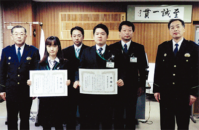 功労者として表彰を受けたのは、同支店の齋藤康彰さんと福田和雄さん、山田美江さん。齋藤さんは昨年12月24日、高齢の女性から「息子が飲酒して事故を起こし300万円が必要だ」という内容の電話を受けた。不信感を抱き粘り強く説得、女性の息子に電話をするなど水際で阻止した。山田さんは1月22日、来店した高齢男性から「100万円を引き出したい」との申し出を受けた。男性の慌てている様子から福田さんと聴取を実施。振り込め詐欺の典型的な事例が書かれたチェック表などを活用し、警察に通報した。