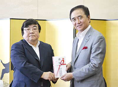 神奈川県内のパチンコ・パチスロホールが加盟し、暴力団の排除活動や福祉貢献などに取り組んでいる神奈川県遊技場協同組合(伊坂重憲理事長)と関連団体の神奈川福祉事業協会(同会長)=鶴屋町=は、5月16日に黒岩祐治県知事を訪問し、県へ鏡台やベッドなど約450万円相当の目録を贈呈した。