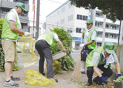 当日は、クラブ名の入ったお揃いの帽子とベストを身にまとった約20人の会員が集結。仕事の合間の1時間にわたり公園内の枯葉やポイ捨てされたゴミを拾った。花火大会直後だったため、垣根に押し込まれたように捨てられた酒類の空き缶などが大量に集められ、45リットルのゴミ袋10個以上が集まった。