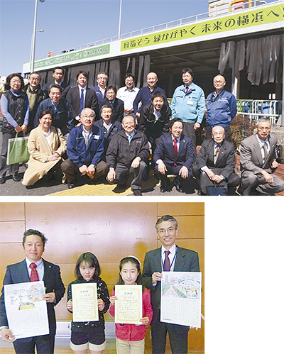 同クラブは、特に感銘を受けた鈴木美結さん(当時小5)の「目ざそう!未来はピカピカの横浜」と山崎真奈さん(同)の「緑輝く未来の横浜へ!」をもとに環境標語を作った。小山会長は同校を訪問し、鈴木さんと山崎さんに感謝状を贈った=写真(下)。