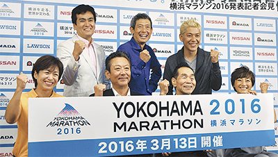 第2回目となる「横浜マラソン2016」の発表記者会見が7月6日、横浜市内で行われた。会見には横浜マラソン組織委員会の山口宏会長をはじめ、1回目に引き続き出走予定の鶴見辰吾さん、石原良純さん、田村亮さん(ロンドンブーツ1号2号)、タレントの福島和可菜さん、また車いす世界記録保持者の土田和歌子さんらが出席し、会見を盛り上げた。