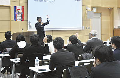 協定締結後初となった今回のセミナーは「学生の学びのモチベーションを高める大学教育」がテーマ。サッカーJ1の横浜F・マリノスで選手育成を担当する小池直文育成ダイレクターが招かれ、教職員や学生75人を前に講演。神大の卒業生でもある小池氏は、よい選手を輩出するための3要素として「タレント発掘」「コーチ」「環境」を挙げ、「信頼関係の構築が絶対条件だ」と持論を展開した。