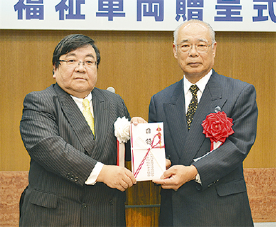 寄贈式では、受贈者から伊坂理事長へ感謝状を贈った。伊坂理事長は「社会貢献の灯は決して消さず、地域に根差した活動を続けたい」と決意を語った。