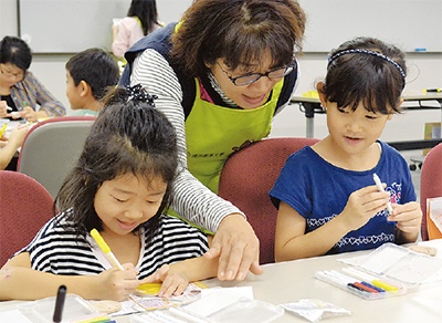横浜創英大学=緑区=のこども教育学部・駒井美智子教授と学生によるワークショップでは、自由に絵を描いた楽器で演奏を行った。神奈川区から参加した児童は「絵を描くのが難しかったけど楽しかった」と笑顔をみせていた。