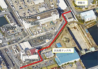 コットンハーバー自治会とコットンハーバーMGT自治会は10月31日、神奈川区役所でコットンハーバー地区から中央市場通りに繋がる歩道・自転車道新設に関する要望書を二宮智美区長に手渡した。要望書には、横浜中央卸売市場内の発砲スチロール置き場の脇を抜け、「京浜港ドックおよび水理・環境実験センター」敷地内に通路を確保する案が示された。