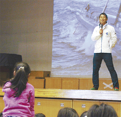 昨年11月に世界一過酷なヨットレースといわれる「ヴァンデ・グローブ」に出場中、幸ヶ谷小学校の全校生徒が通信ソフトウェアを通じて応援メッセージを届けた。感謝を伝えるために来校し、全児童705人が参加する全校集会で「冒険授業」を行った。