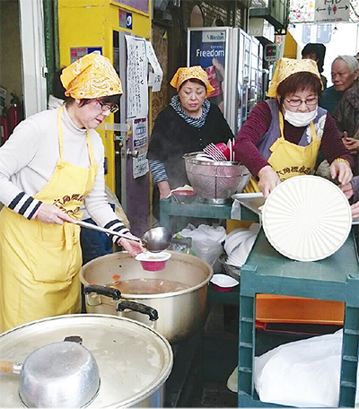 六角橋商店街おかみさんの会「元気かい」は3月5日、恒例の「うまいもの市場」を同商店街のふれあい通りの商店街事務所前で開いた。
