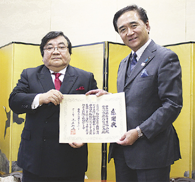 神奈川県(黒岩祐治知事)は3月21日、神奈川県動物保護センターの建設基金の寄付に協力した神奈川県遊技場協同組合(伊坂重憲理事長)と神奈川福祉事業協会(同会長)に感謝状を贈った。