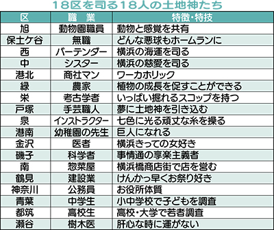 物語の見どころは、各区を司り、十人十色の個性と職業、必殺技を持った18人の「土地神」たち。蜂須賀さん自身が市内を自転車で巡って調べ感じた地域の歴史や特性をもとに1人1人作られた。