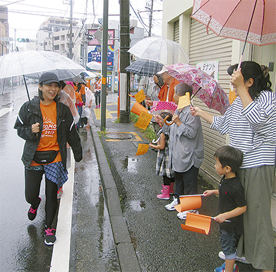 松本町のカフェをスタートし、区役所や六角橋交差点を経由してゴールの片倉三枚地域ケアプラザまで走る約5・3Kmのコース。雨のなか、認知症サポーターのシンボルカラーであるオレンジ色のTシャツを着たランナー30人が、リレー形式でタスキをつないだ。