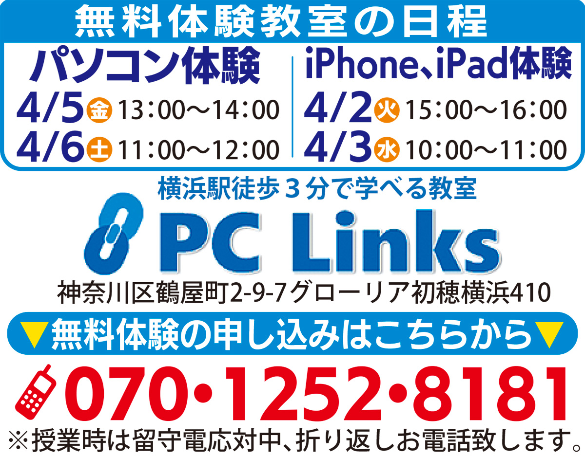 シニア向けパソコン教室「PC Links」では、iPhoneとiPad、パソコンの無料体験教室を4月2日(火)から2回ずつ開催する。