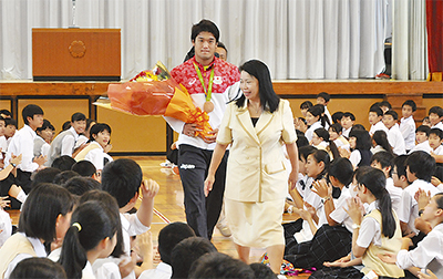 六角橋中学校(阿部雅子校長・生徒数845人)で8月29日、同校の卒業生でリオ五輪柔道100kg級銅メダリスト・羽賀龍之介さん(25)による講演会があった。