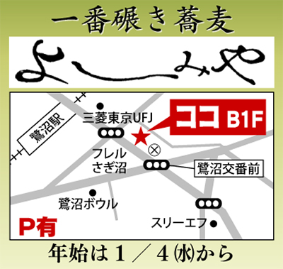 同店ではこだわりのそばを自宅で味わってほしいと、年越しそばを予約販売する。打立ての一番碾き蕎麦(300g1600円)と茹でやすい「生ふる舞い」(限定200パック・450g1600円)の2種類。ともにそばつゆ付。自慢の海老天ぷらも購入できる。3本1300円。予約は12月28日(水)まで。商品の引き渡しは12月30(金)と31日(土)。