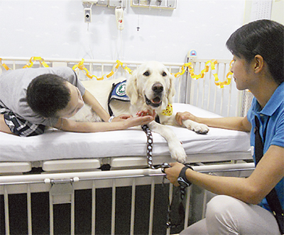 育成を担当するNPO法人「シャイン・オン!キッズ」の小寺真理子さんは「入院すると心細くて笑顔が減ってしまう子どもも、犬と接することで笑顔を見せるようになったり治療に前向きに取り組むようになる」と効果を話す。