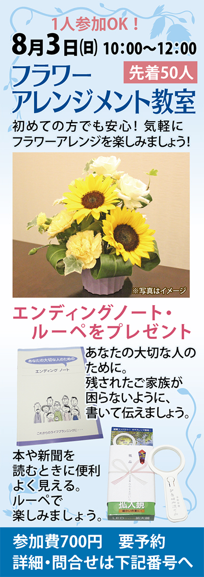 区内土橋の綜合葬祭式場『平安会館みやまえだいら』では8月3日(日)、生花を使ったフラワーアレンジメント体験教室を開催する。午前10時から正午まで。先着50人。要予約。参加費700円。定員になり次第受付終了。花切ハサミのある人は持参を。参加者にはエンディングノートとルーペをプレゼント。