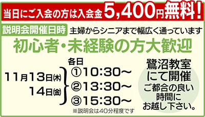初心者でも気軽に通えると主婦やシニアから評判の『パソコン市民IT講座』では今年最後の入会キャンペーンを実施中。説明会当日入会で入会金5400円が無料に。同教室では電源の入れ方が分からないという初心者から、チラシを作りたい、資格を取りたいという中級・上級者まで一人ひとりに合わせて気さくな講師が個別に対応してくれる。