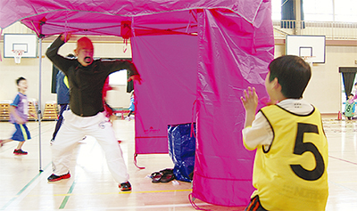 子どもたちは逃げる際に大声を出せるようにするための「大声ランニング」や、座った姿勢や後ろを向いた状態からダッシュする「変形スタート」などを通して、防犯の心得を学んだ。また、犯人の特徴を一瞬で覚えて逃げ、伝えていくリレーではチームで協力しながら防犯意識を高め合っていた。犯人役を務めた講師の中野道明さんは「親子で防犯について考えるきっかけになれば」と話していた。