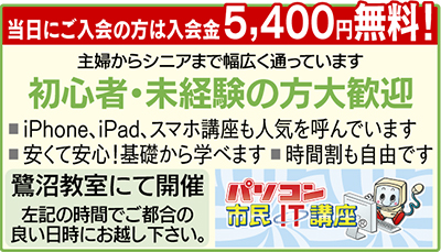 鷺沼駅前ビル4階にある『パソコン市民IT講座』が人気だ。1講座1400円という料金設定で都合に合わせて自由に通える。室内は明るく、清潔感があり居心地がいいと生徒からも好評だ。