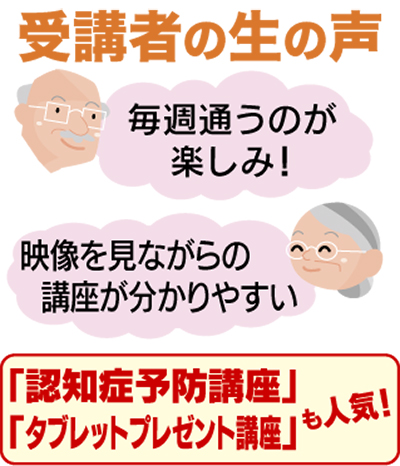 現在、同教室では「初めて使うタブレット講座」の予約受付中。受講者には今春発売の新型タブレットを無料でプレゼント。さらに、脳科学研究の権威・久保田競教授監修の「認知症予防講座」が6月からスタート。パソコンで指先を動かすことは脳の活性化につながるとも言われている。