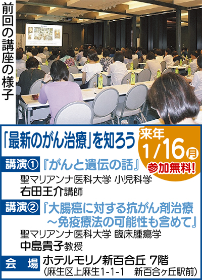 聖マリアンナ医科大学がんプロフェッショナル養成基盤推進プラン主催の市民公開講座「最新のがん治療を知ろう」が来年1月16日、新百合ヶ丘駅前ホテルモリノ新百合丘7階を会場に開かれる。現在参加者を募集中。時間は午後3時から4時30分まで(2時20分開場)。参加費無料、定員先着100人(事前申込制/本人含め4人まで申込み可能)。