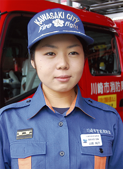 「父の姿に憧れたのとポンプ操法がやりたくて消防団に入りました」と話すのは宮前消防団土橋班の団員、山影純子さん(区内小台在住)。団員115人中、女性は8人で最年少だ。