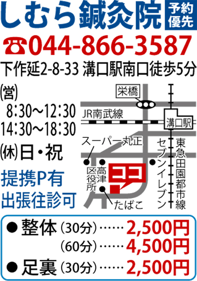 区役所裏手にはりきゅう、整体、足裏マッサージが専門の「しむら鍼灸院」が開院した。志村院長は生まれも育ちも高津区。「培った技術を地元の方に」と住み慣れたこの地でのオープンを決めた。